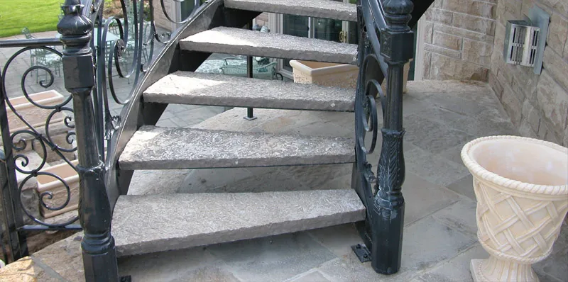 Cut Steps are naturally faced on three or four sides and are available in a variance of 5"- 8" in height and 2'- 10' length. The cut step comes in a standard width of 16-18". Cut steps are sold by the square foot or linear foot. They are available in Limestone, Sandstone and Granite.